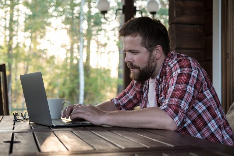 mieshenkilö osallistuu webinaariin tai kokoukseen tietokoneella
