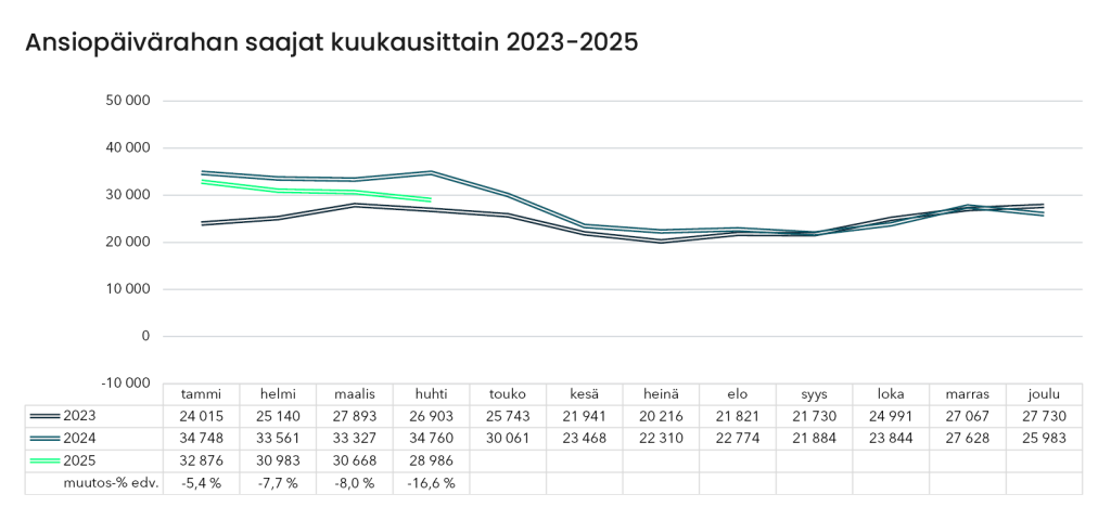 Avoimen työttömyyskassan A-kassan tilastojen mukaan A-kassan ansiopäivärahan saajien määrä jatkaa selvää laskuaan. Huhtikuussa päivärahansaajia oli 28 986, mikä on yli 16 prosenttia vähemmän kuin vuosi sitten samaan aikaan. Lomautettujen määrä on vähentynyt vielä nopeammin – yli 30 prosenttia vuoden takaisesta. Kokonaan työttömien lukumäärässä ei ole tapahtunut merkittävää muutosta. Huhtikuussa 2025 heitä oli 13 543, kun vuotta aiemmin vastaava luku oli 13 943.