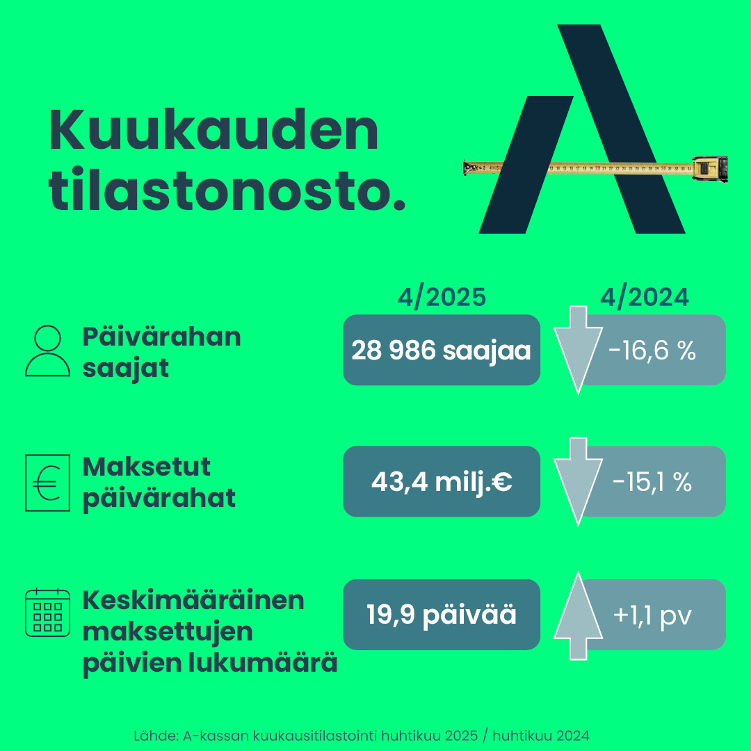 Huhtikuussa 2025 keskimääräinen päiväraha A-kassassa oli 75,06 euroa, kun vuotta aiemmin se oli 77,49 euroa.