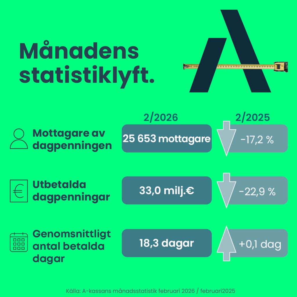 I februari fortsatte antalet mottagare av inkomstrelaterad dagpenning från A-kassan att minska jämfört med i fjol, men på månadsnivå förblev läget nästan oförändrat. Antalet ansökningar var klart lägre i februari än året innan, och särskilt antalet första ansökningar minskade från januari. Samtidigt var andelen permitterade fortsatt hög, och även om antalet mottagare minskade, ökade utgifterna för inkomstrelaterad dagpenning något jämfört med föregående månad. Siffrorna för början av mars tyder på att antalet mottagare åter kan vara på väg att öka svagt.