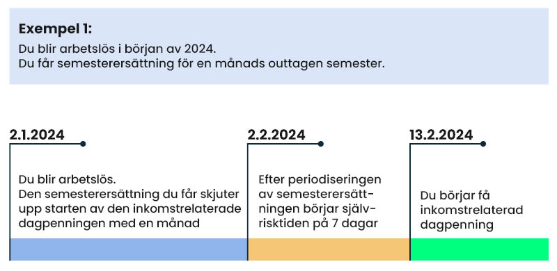 Periodiseringen av semesterersättningen och självrisktiden löper inte samtidigt. Självrisktiden börjar först efter periodiseringen av eventuell semesterersättning. Självrisktiden är sju dagar.