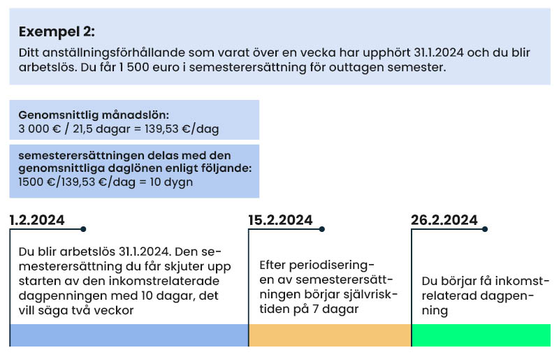 Semester som inte tagits ut när anställningsförhållandet upphör skjuter alltså upp rätten till när inkomstrelaterad dagpenning börjar med så många dagar som den genomsnittliga lönen för de semesterdagar för vilka semesterersättning utbetalats motsvarar. Periodiseringstiden löper från måndag till fredag, fem dagar i veckan.