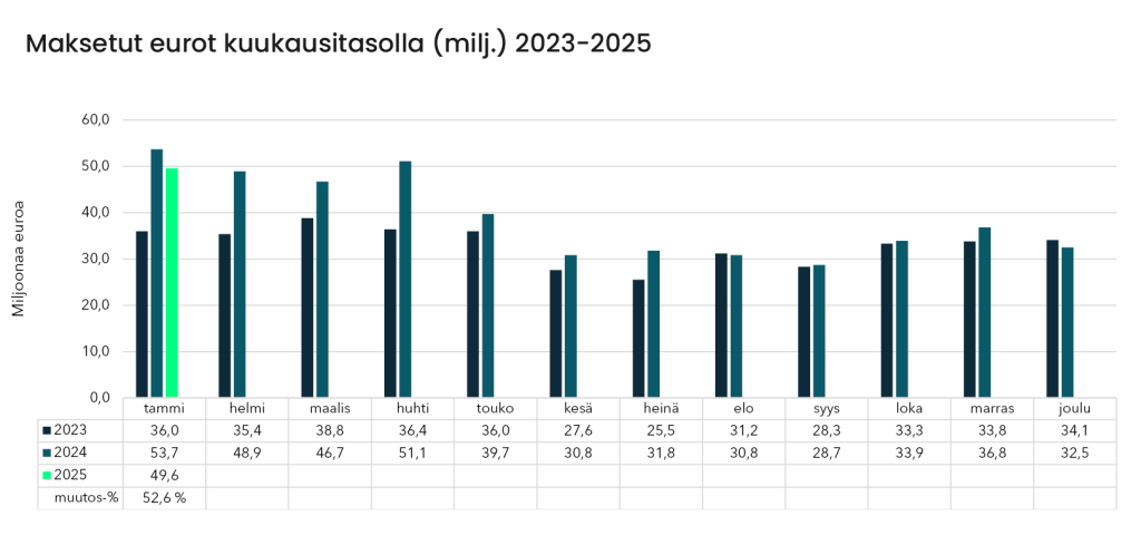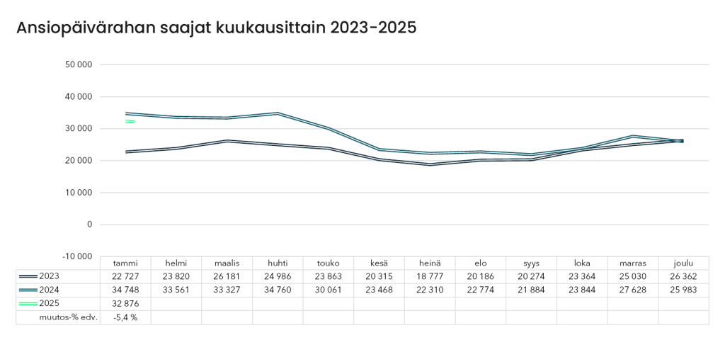 Maksettujen ansiopäivärahojen kokonaismäärä putosi selvästi, jopa 8,9 prosenttia edellisvuoden vastaavaan jaksoon verrattuna, ollen yhteensä 82,1 miljoonaa euroa. Keskimääräinen maksettujen päivien määrä pysyi lähes ennallaan, ollen 18,2 päivää, kun vuotta aiemmin se oli 18,4 päivää. Päiväkohtainen ansiopäiväraha keskimääräisellä 20 päivän maksujaksolla oli tammikuussa 76,65 euroa, mikä on 3,1 prosenttia vähemmän kuin viime vuonna.