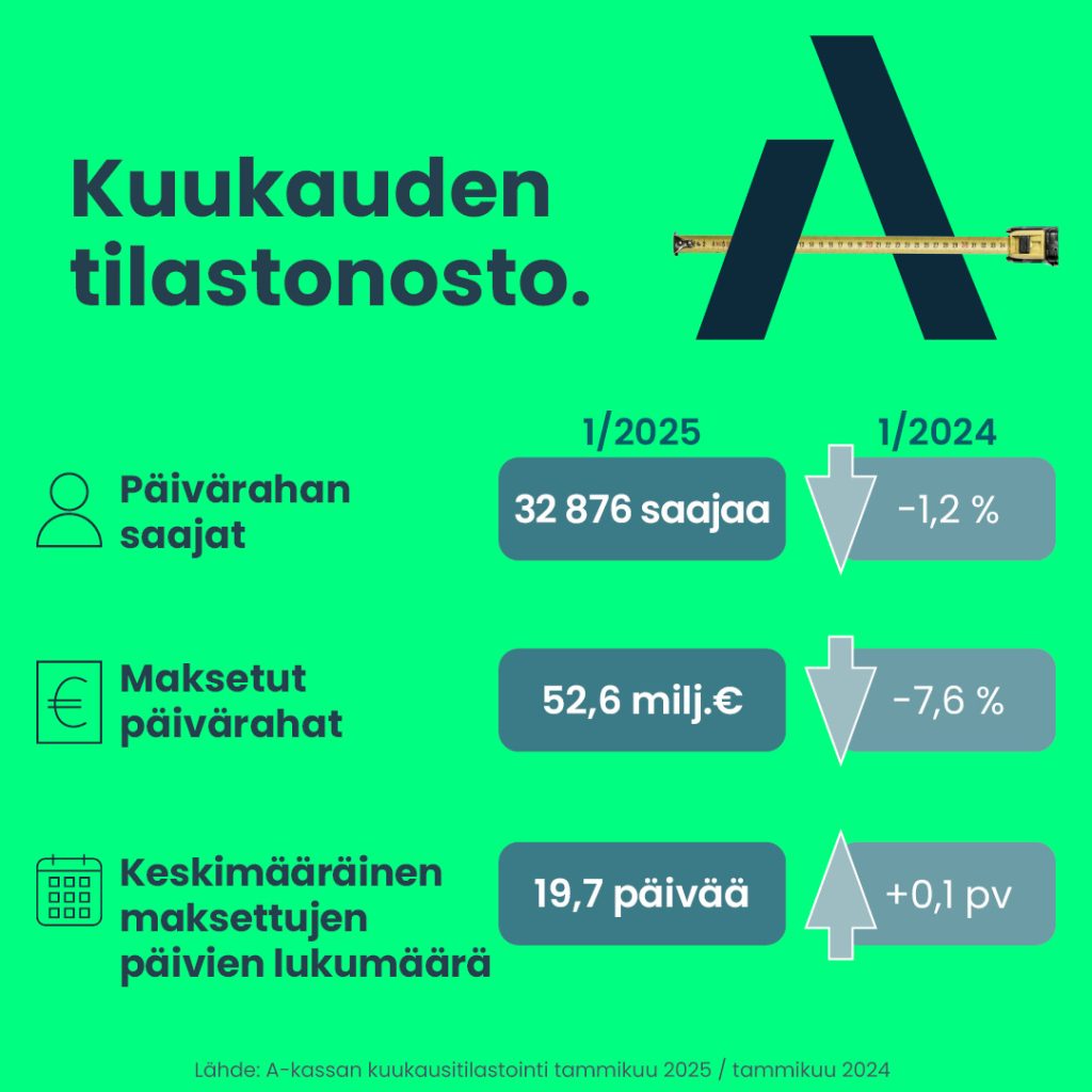 A-kassan ansiopäivärahan saajamäärä laski joulu-tammikuussa, mikä viittaa orastavaan työllisyystilanteen parantumiseen. A-kassasta ansiopäivärahaa sai kyseisenä ajanjaksona 36 925 jäsentä, mikä on 5,4 prosenttia vähemmän kuin vuosi sitten. Vielä marraskuussa saajamäärä oli nousussa, mutta joulukuussa tapahtui käänne, ja määrä lähti laskuun.